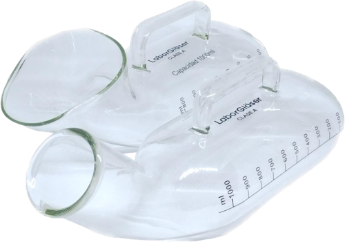 Descripción: Pato urinario de vidrio transparente con asa de transporte, capacidad 1 litro máximo, con graduación negra.